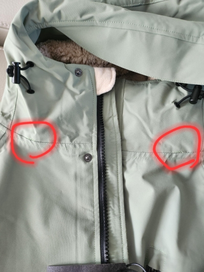 모자와 본체 연결되는 부분에 양쪽모두 사진에 동그라미친 구멍 및 박음질이 있는데요. 이게 혹시 불량인건지, 아니면 박음질 떼어내고 입는건지(새상품 주머니 박듯 임시박음질인지) 문의드려요