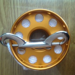 핑거홀 직경은 3CM 이며 총 직경은 8CM입니다. 스풀 감는 부분 두께는 2.5CM이며 추가로 1.5CM의 공간에 더블스냅을 걸수 있도록 되어있습니다. 장점은 마감이 좋다는것과 핑거홀 직경이 무척이나 크다는 것입니다. 5mm장갑끼고도 문제 없을거 같습니다. 단점은 핑거홀 직경에 비해 스풀을 감는 공간의 높이와 폭이 쫍아서 다 감으면 20M길이의 스풀이 직경 밖으로 튀어나옵니다.